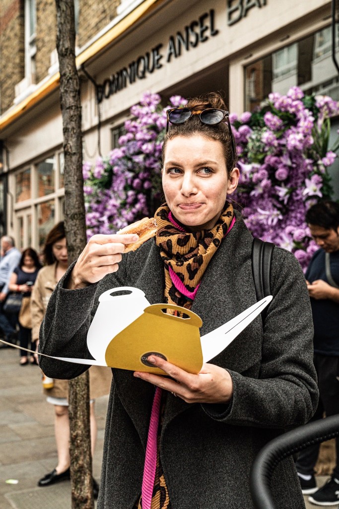 Der Blätterteig ruht drei Tage, bis er die perfekte Konsistenz hat. Dann wird er frittiert, bekommt eine Cremefüllung und einen Zuckerguss. Welche Füllung er hat, wechselt jeden Monat. Im Mai kamen wir in den Genuss des „Apricot & Honey Chamomile Cronuts“. Es war unser erstes Mal. 🙂